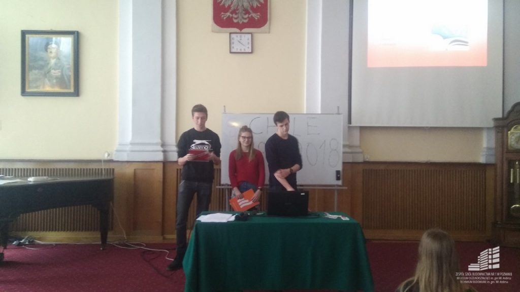 W roku 2018 wspominamy 200-lecie państwa Chile, które w 1818 r. stało się niezależną republiką. W związku z tą rocznicą, 9 lutego odbyła się w naszej szkole konferencja pt. „Chile kraj znany-nieznany” poświęcona Chile. Organizatorzy: mgr Mateusz Hurysz, mgr Kamila Krzesińska, mgr Agnieszka Klunder mgr Karolina Nowakowska podczas swoich wystąpień, przybliżyli w ciekawy i przystępny sposób kulturę, muzykę, specyfikę geograficzną oraz konstytucję państwa Chile. Wśród prelegentów znaleźli się również uczniowie: Kamil Jaskulski (2a) oraz Patryk Bogdan (1b), którzy przybliżyli słuchaczom postać chilijskiego dyktatora Augusta Pinocheta oraz historię Wyspy Wielkanocnej. Dodatkową atrakcją było wystąpienie grupy uczniów z klas 2b i 1a, którzy pod nadzorem