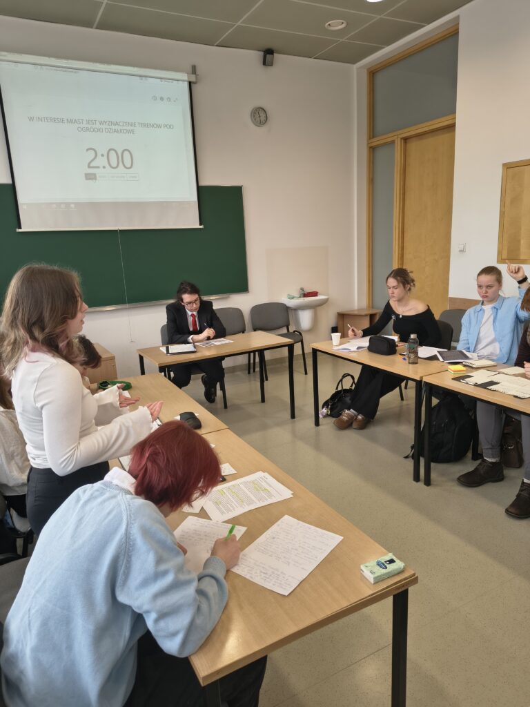 Teza debaty brzmiała: „W interesie miast jest wyznaczanie terenów pod ogródki działkowe”. Nasz zespół występował po stronie propozycji, przedstawiając argumenty dotyczące m.in. jakości życia mieszkańców, funkcji społecznych i środowiskowych takich przestrzeni oraz ich wpływu na zrównoważony rozwój miast.