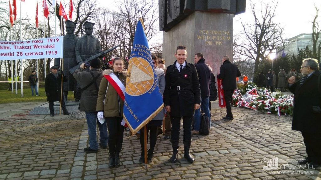 W środę, dnia 27 grudnia 2017 r. dokładnie w 99. rocznicę wybuchu Powstania Wielkopolskiego, reprezentacja naszej szkoły w osobach: Wiktoria Zielska z 3 b, Nadia Dur z 1 at i Aleksandra Gajewska z 1 ct pod opieką nauczyciela historii uczestniczyła przy ładnej pogodzie w oficjalnych uroczystościach tego pamiętnego zrywu niepodległościowego. Odśpiewaliśmy hymn państwowy, wysłuchaliśmy podniosłych przemów, a także zobaczyliśmy, jak wielka liczba delegacji oddała hołd Powstańcom Wielkopolskim. Warto dodać, że na gmachu naszej szkoły oprócz flag państwowych, powieszona była flaga powstańcza.
