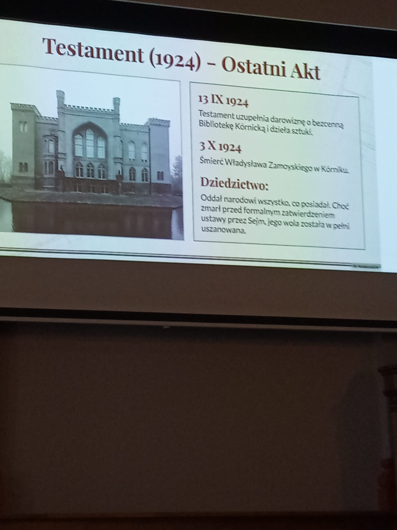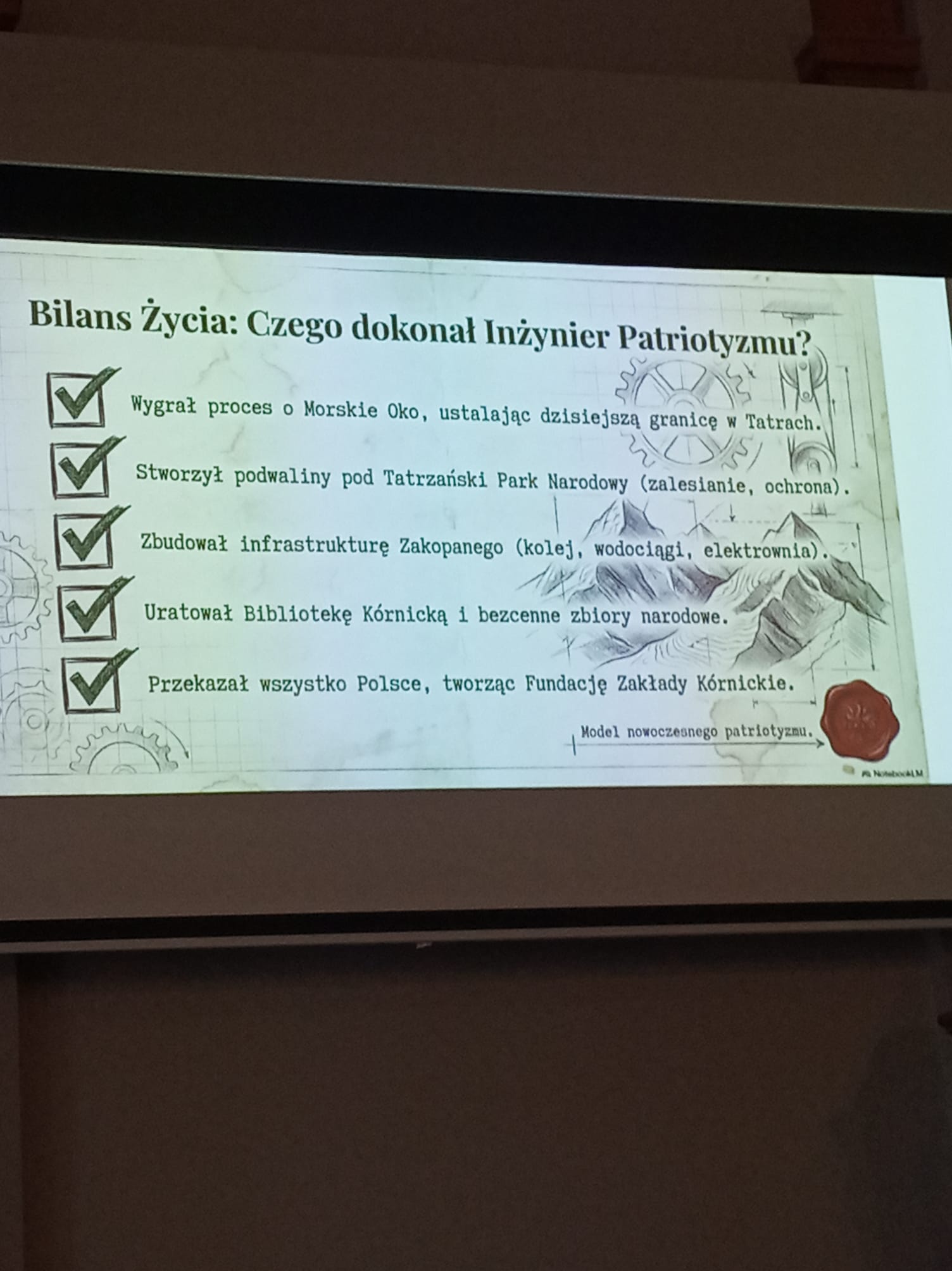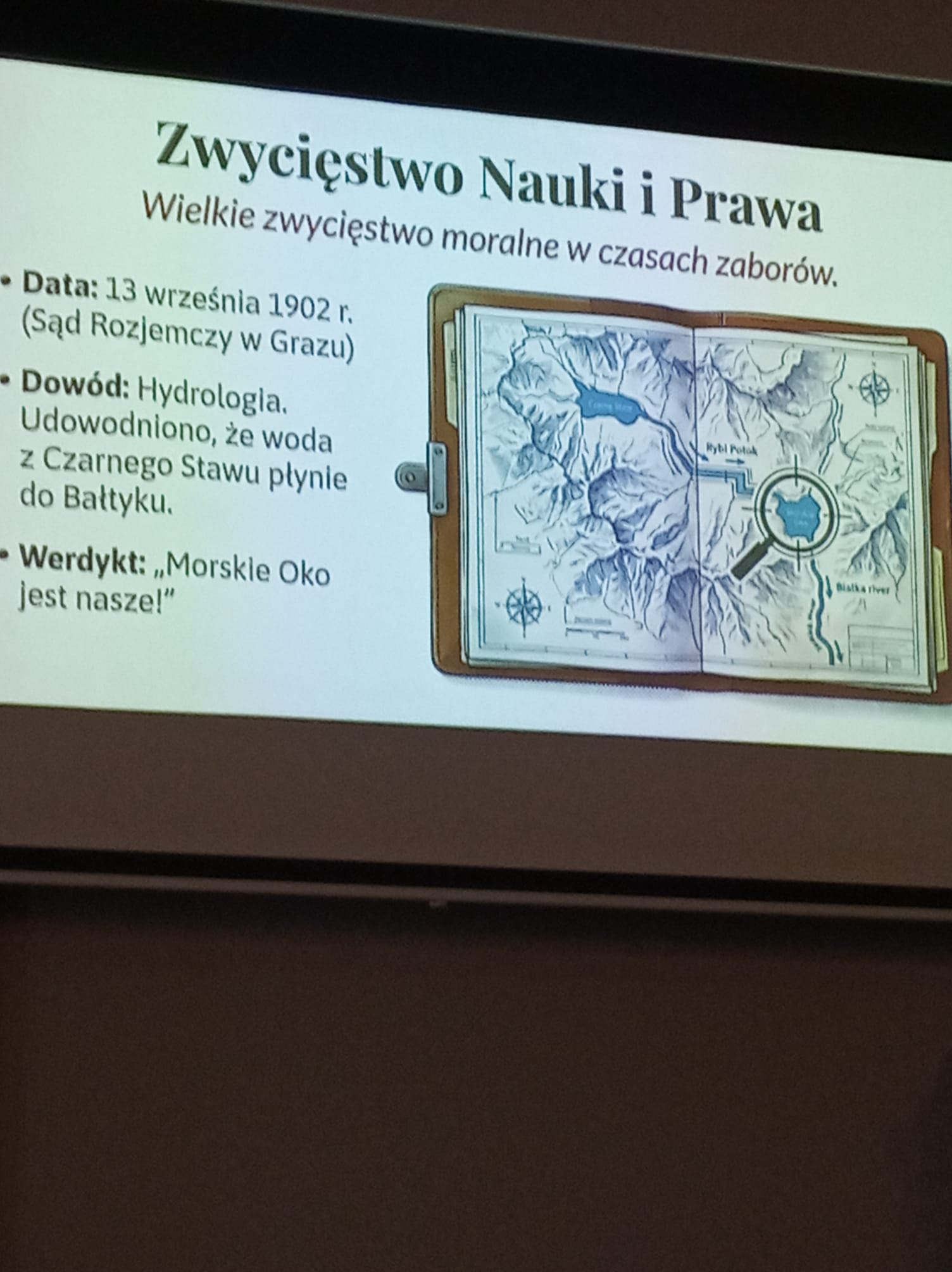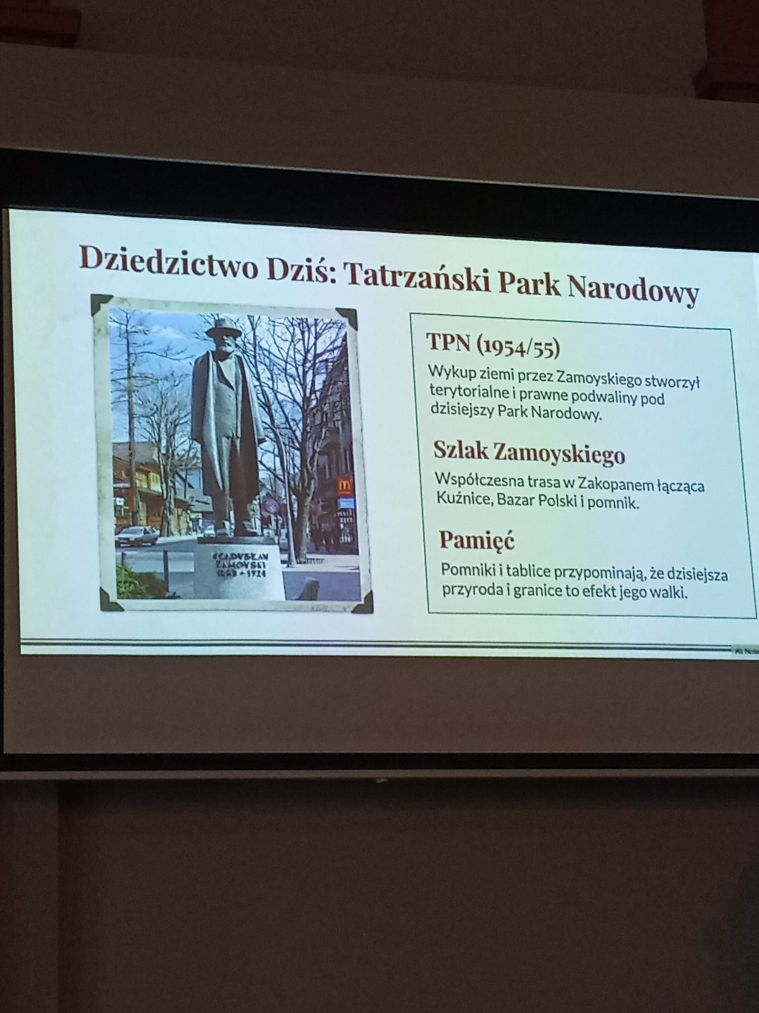 W auli szkolnej odbyło się podsumowanie Dni Nauki Polskiej z udziałem reprezentantów wszystkich klas. Pan A. Wyrwał przygotował niezwykle interesującą prelekcję o tym, w jaki sposób Władysław Zamoyski odzyskał dla Polski Morskie Oko oraz dlaczego zdecydował się na zakup Zakopanego. Podczas spotkania przedstawiono również wyniki konkursów, a zwycięzcom wręczono okolicznościowe dyplomy.