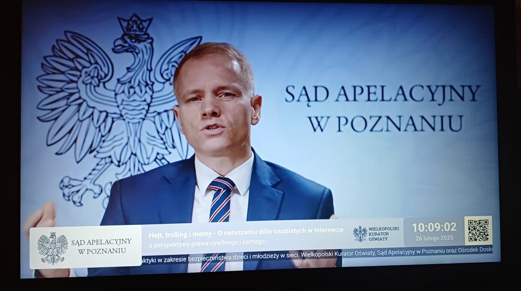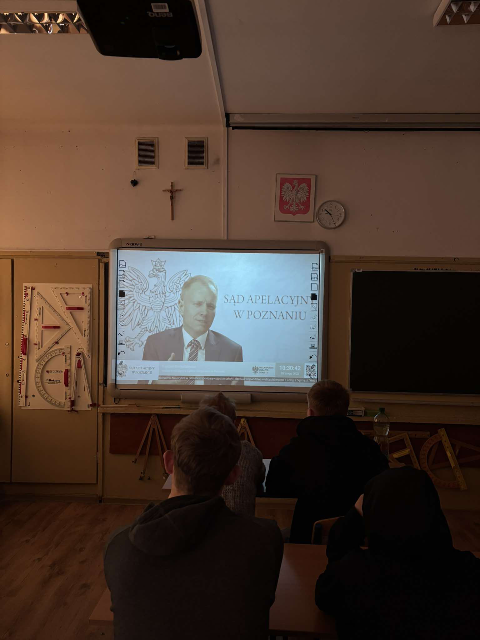 26 lutego 2025 r. w godz. 10:00–12:00 klasa 3B wraz z wychowawcą, p. Patrycją Gołębowską, uczestniczyła w e-lekcji prowadzonej przez sędziego Kajetana Kosterkiewicza z Sądu Okręgowego oraz Zastępcę Koordynatora ds. Edukacji Prawnej Sądu Apelacyjnego w Poznaniu.