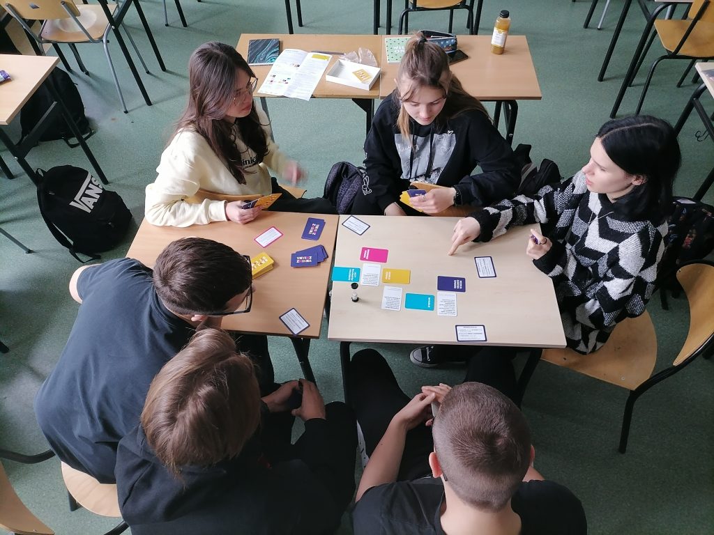 Młodzież z klasy 4BCT w ramach zajęć WOSu, grała w grę dyskusyjną „Włącz zmianę”, pokazującą różnorodność sektora organizacji pozarządowych w całej Polsce oraz otwierającą przestrzeń do rozmowy o ich działaniach i ich efektach. Gra przygotowana w ramach projektu przez Fundację Pole Dialogu i Centrum Edukacji Obywatelskiej niewątpliwie rozwija kompetencje społeczne i obywatelskie, ale co najistotniejsze, w opinii samych graczy jest po prostu ciekawa.