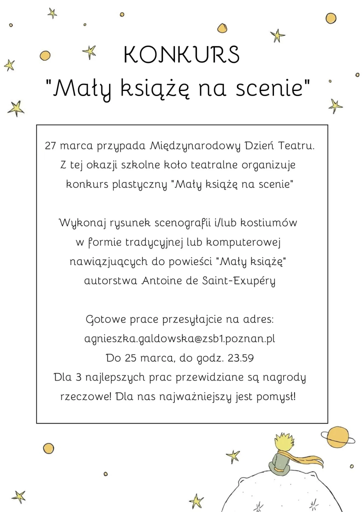Szkolne Koło Teatralne zaprasza wszystkich uczniów do wzięcia udział u konkursie „Mały Książe na scenie”.