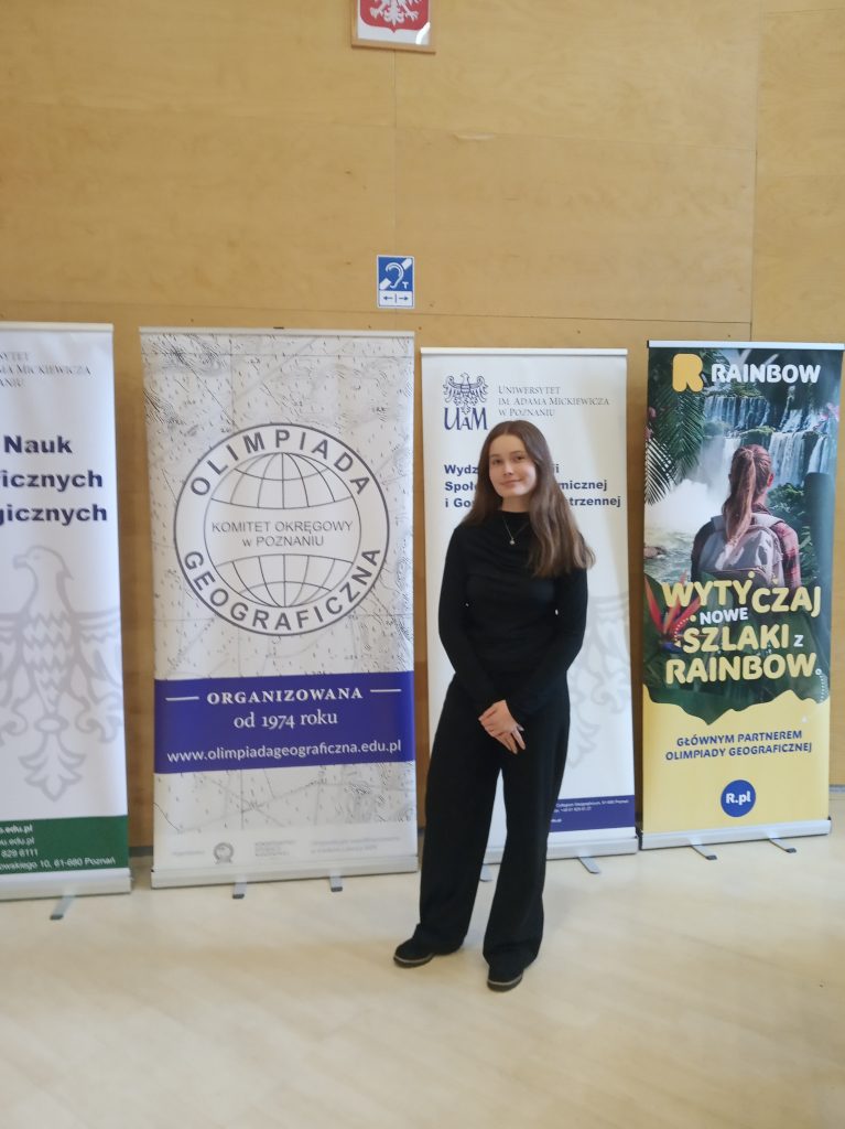 LI Olimpiada Geograficzna istnieje od roku szkolnego 1974/1975. Realizowana jest w trzech etapach – szkolnym, okręgowym i ogólnopolskim. Podstawowym wyróżnikiem spośród innych olimpiad przedmiotowych jest przygotowanie na poziomie I etapu pracy badawczej zgodnie z wybranym przez ucznia tematem, która odnosi się do konkretnej przestrzeni geograficznej lub obiektu oraz zachodzących procesów przyrodniczych i gospodarczych. Praca naszej uczennicy z klasy IV AL2, Katarzyny Bartkowiak, została wysoko oceniona i dzięki temu Kasia, 8 lutego 2025 r., wzięła udział w etapie okręgowym, w jego pierwszej, pisemnej części, uzyskując bardzo dobry wynik.