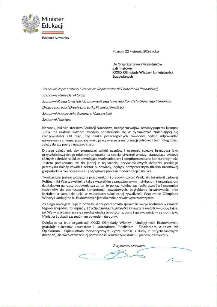 Chwila wielkiego triumfu i zasłużonych emocji – na podium stanęli najlepsi z najlepszych w zawodach centralnych Olimpiady Wiedzy i Umiejętności Budowlanych: 22 kwietnia 2026