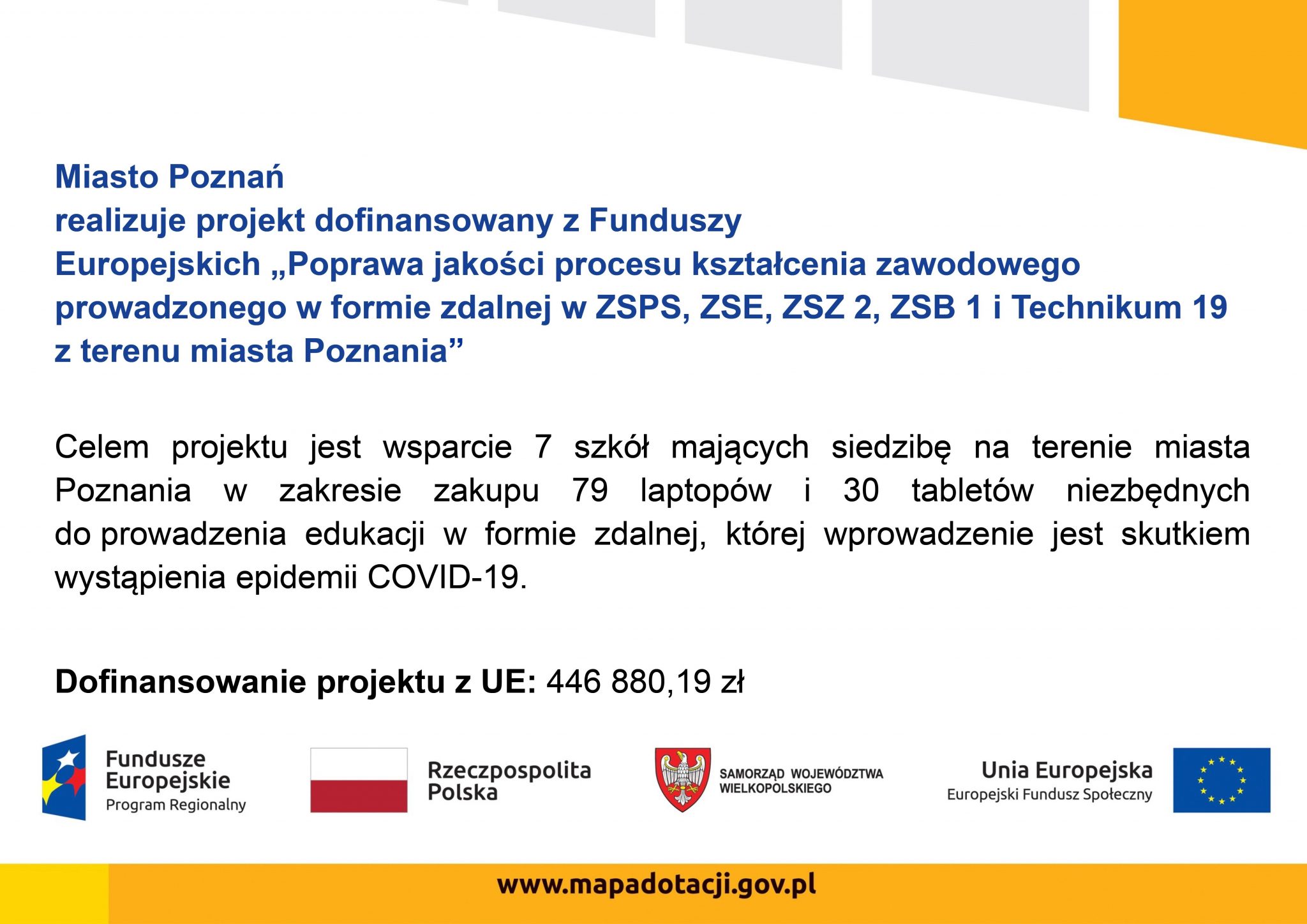 Celem projektu jest zapobieganie / łagodzenie skutków epidemii COVID-19 poprzez zakup i dostawę sprzętu przeznaczonego do prowadzenia nauki w formie zdalnej w postaci 79 laptopów z oprogramowaniem oraz 30 tabletów dla nauczycieli i uczniów z 7 szkół prowadzących kształcenie zawodowe z terenu miasta Poznania.