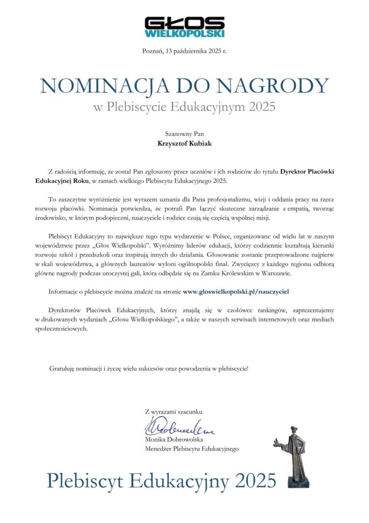 Dyrektor Zespołu Szkół Budownictwa nr 1 w Poznaniu, Krzysztof Kubiak, został nominowany w Plebiscycie Edukacyjnym 2025 organizowanym przez Głos Wielkopolski.