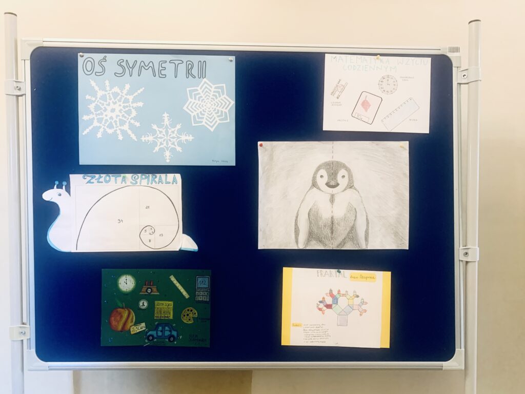 Na III piętrze szkoły prezentowane są najlepsze prace uczniów o charakterze matematyczno-plastycznym, nagrodzone w konkursie „Symetria wokół nas”. Wystawa ukazuje, w jaki sposób pojęcie symetrii łączy matematykę ze sztuką, a uczniowska kreatywność i wyobraźnia znajdują odzwierciedlenie w formach graficznych oraz artystycznych kompozycjach. Prace stanowią efekt twórczej interpretacji zagadnień matematycznych i świadczą o wysokim poziomie zaangażowania oraz pomysłowości autorów.