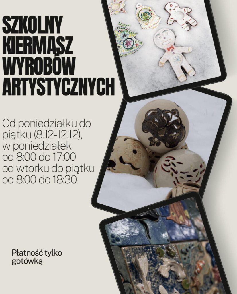Zapraszamy na Szkolny Kiermasz Wyrobów Artystycznych, który odbywa się w naszej szkole branżowej przy ul. Jerzego. To świetna okazja, by zobaczyć i kupić prace wykonane przez naszych uczniów