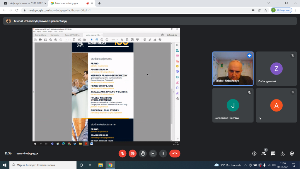 We wtorek 7 grudnia klasa 3GA2 uczestniczyła w spotkaniu online z p. Michałem Urbańczykiem, profesorem Wydziału Prawa i Administracji UAM. Pan profesor przedstawił nam kierunki oferowane w ramach wydziału, ze szczególnym uwzględnieniem prawa oraz ścieżek kariery dostępnych po jego ukończeniu (aplikacja radcowska, adwokacka, sędziowska, prokuratorska). Odpowiadał też na nasze liczne pytania.