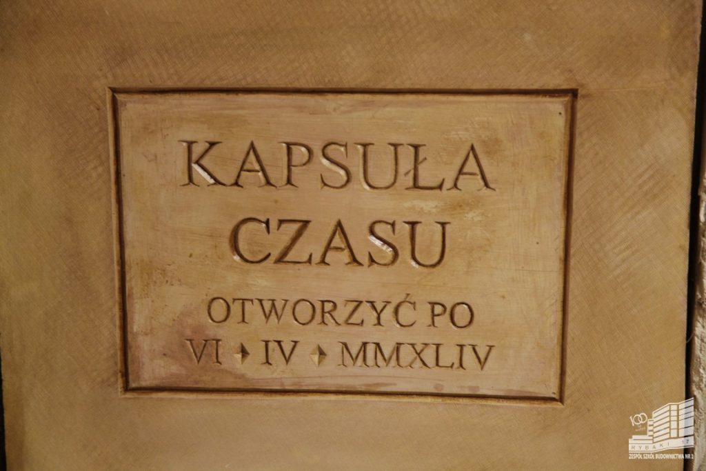 Dla tych co będą przygotowywać kolejny jubileusz przygotowaliśmy kapsułę czasu. W specjalnej skrzynce zostały umieszczone listy „dyrektora do dyrektora”, „ nauczycieli do nauczycieli”, „uczniów do uczniów”. Zostało też przygotowane przesłanie dla tych, którzy będą się zajmować utrzymaniem budynku. Do kapsuły włożyliśmy też przygotowane przez uczniów informacje o klasach, plany lekcji, arkusze egzaminacyjne, nawet sprawdzian. To z takich szkolnych rzeczy. W kapsule znalazły też miejsce narzędzia pracy naszych techników, przybory do pisania i kreślenia – ołówek i długopis, linijka i ekierki. Zostały również włożone przedmioty pozwalające na sprawienie sobie drobnych przyjemności – kawa, herbata, herbatniki, perfumy.