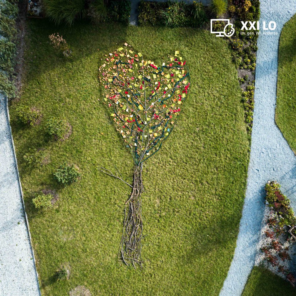 Jeśli Sztuka Ziemi to tylko poza galerią, czyli outdoorowo. Jeśli Land Art, to tylko dzieła tworzone z natury, w naturze; fotografowane z lotu ptaka. 13 października klasa 1AL2 wyprawiła się na obrzeża Puszczy Zielonki do miejscowości Kliny, w której znajduje się magiczne miejsce – Finlandia Spot: drewniane domki przywiezione z Finlandii. W tym zakątku Skandynawii, uczniowie tworzyli obiekt – drzewo z różnych elementów występujących w przyrodzie