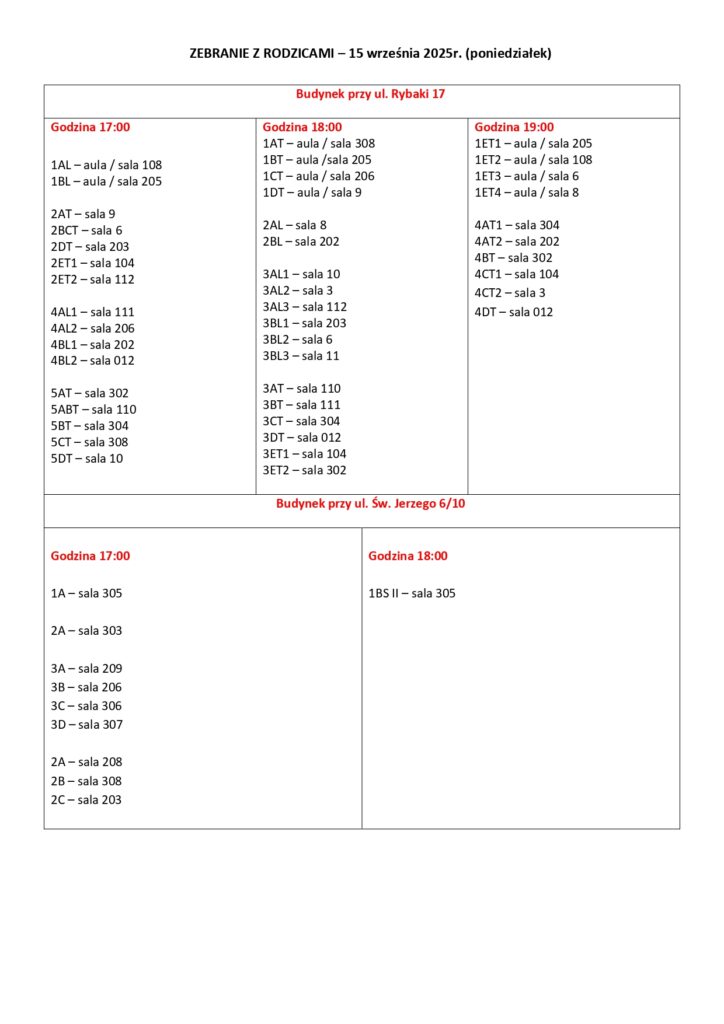 Zebrania z rodzicami odbędą się w poniedziałek 15 września 2025 r. – zgodnie z harmonogramem w załączonym planie. Zapraszamy!